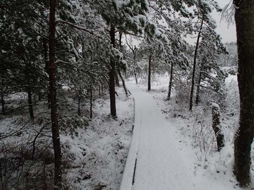 En sista burk fanns på dagens lista, en burk i ett träd! ”Ugglemossen runt – Tallen” behövde jag dock inte klättra till, det fanns trä-pinne-teknologi på platsen som löste problemet. Därmed behövde jag inte avsluta med en DNF, det var illa nog med 50% DNF:er under vandringen!! Motion fick jag som den viktigaste belöningen, 15 kilometer i ett snötyngt sagolandskap.