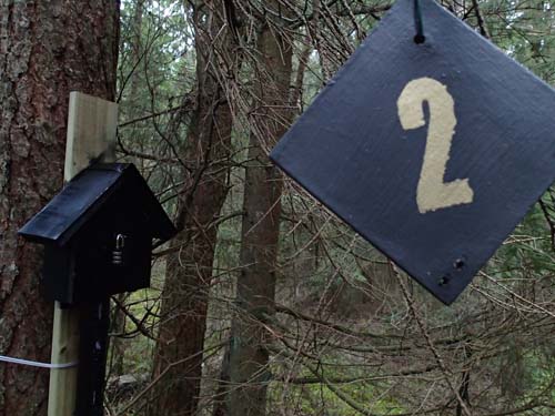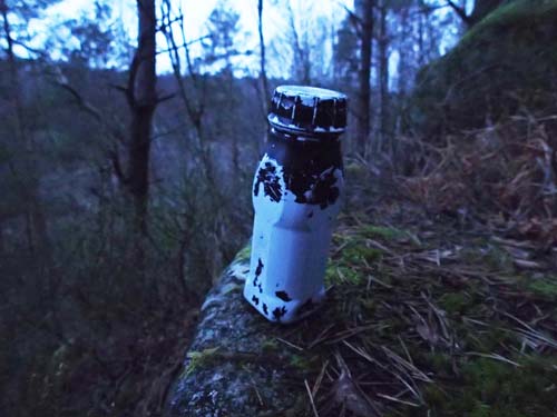 När jag klev fram på den blöta och leriga stigen plingade det glatt i min telefon – vad nu? – tänkte jag och drog fram telefonen för att läsa meddelandet. Ett antal nya burkar hade publicerats, mindre än två kilometer från den plats där jag befann mig, vad skulle jag göra? Svaret är väl ganska givet! Likt en frustrerad älg korsad med mr Bean hoppade jag över stock och sten i riktning mot ”Trinislas utmaningar – #9 En av granarna”. När den snygga holken öppnades möttes jag av en blank loggremsa – det blev en FTF… Koordinaterna till ”Trinislas utmaningar – #8 Pippi” matades in, det var lite över 161 meter dit. Redan på håll såg jag två figurer som rörde sig mellan träden, det var christinah2 och O2le som var i färd med att öppna burken, jag kom i lagom tid för att vara med på en delad FTF. Vi slog sedan följe bort till ”Trinislas utmaningar – #6 Betong”.
