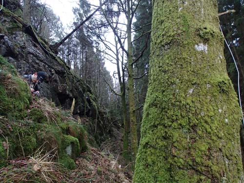 När burken var loggad gick jag rakt ned för sluttningen och följde bergssidan nere vid Ugglemossen. Jag anade att det var den rätta nivån för att på ett bra sätt komma till ”Ugglemossen runt – Rätvinklig”. Vid mitt förra besök där prövade jag uppifrån, vilket inte var en bra väg… Denna gång hittades dock burken helt utan problem – härligt!