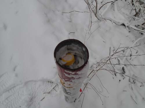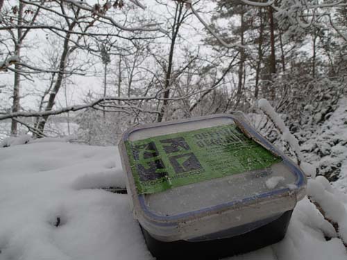 Som alltid när det är vinterväder drabbas man av att burkarna sitter fast i is, ”Ordpussel 14 (MMT#50)Här svänger vi mot Billdal”, satt rejält fast och jag tvingades ta till fotologg.