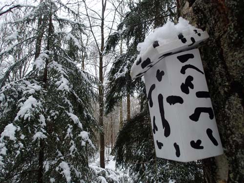 Strax bortanför djurens gravar gjorde jag ett försök att hitta ”Gyllene skatten” men snön försvårade för mig på denna plats, jag hittade en del rötter men inte någon burk. Istället sökte jag mig mot ”Pontus holk” som var snösäker och lätt kunde hittas när jag väl hittat en lämplig väg runt de blötaste partierna i skogen.