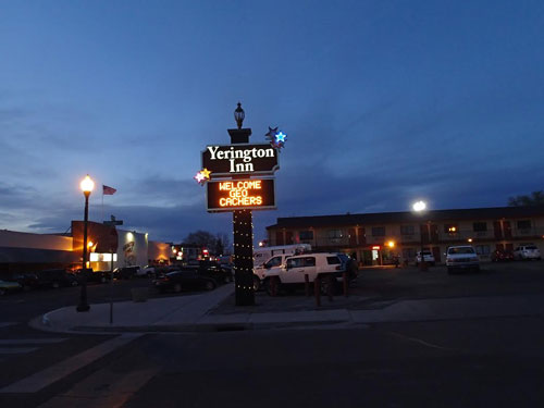Det var lite oväntat att mötas av en stor skylt – Welcome Geocachers! Yerington Inn har dessutom rabatt för geocachare som bokar rum direkt via e-post eller telefon, den rabatten får man inte vid bokning via exempelvis booking.com. Även receptionen var cachinganpassad – på vilket sätt lär du upptäcka vid ett eventuellt besök.