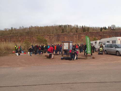 Det var mycket folk i det gamla stenbrottet. Alla var redan igång med sedvanligt burkprat och det blev många roliga möten med gamla bekanta och nya nic. Givetvis fick vi också logga cachen ”Tillbakablick” som fanns mitt på eventplatsen, dess loggremsa fylldes snabbt till bristningsgränsen.