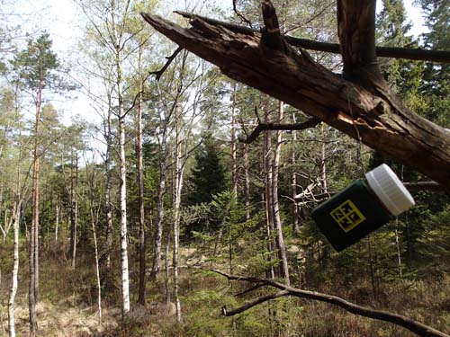 Istället begav jag mig in i Råhultsskogen för att fortsätta burkjakten. Vandringen gick nu genom ett ganska blött sankmarksområde fram till ”Råhultskogen #2” som vållade en del problem, vid nollan fanns inte någon burk, men så läste jag Sisjötrollens logg om att burken hittats 15 meter bort, vilket fick mig att vidga sökområdet. För mig påträffades burken 20-24 meter från nollan!!