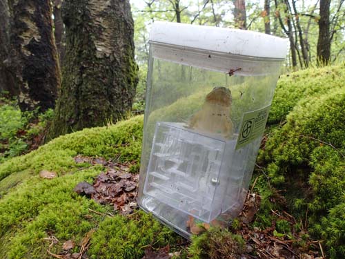 Sökandet inleddes och det tog ganska lång tid att hitta cachen. Jag snurrade runt träd efter träd efter träd efter träd, men så tillslut fick jag se något mycket lovande, ett PET rör som svävade högt över mitt huvud!