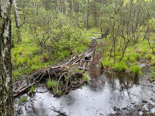 Nu var det bara knappt 200 meter till dagens första cache, men det är sällan som den raka vägen är enkel. Det har förr funnits en liten användbar spång i rätt riktning, men jag var lite tveksam till att använda den så som den såg ut idag!