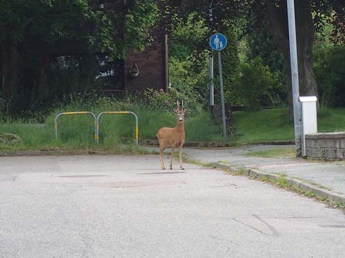 På Midsommardagens förmiddag gav jag mig ut på en kombinerad geocaching och motionsrunda, 20 kilometer skulle det bli denna dag. Jag hade siktet inställt på Öjersjö och gick därför först lite åt öster innan jag svängde av mot söder, det är synnerligen olämpligt att försöka går raka vägen genom Delsjöområdet! Redan innan jag nått fram till ”vildmarken” behagade en rå-typ att visa sig mitt på gatan.