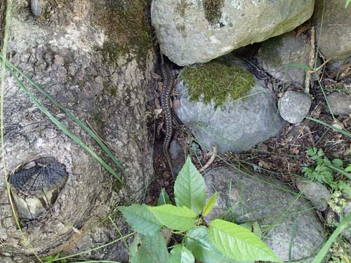 Det är inte bara i Nevadas öknar som man bör se sig för var man sätter ned fötterna. Jag höll på att kliva in bland buskarna vid ”G #03 V Ö P T” såg jag något ringla iväg, någon decimeter framför kängorna, en huggorm, som fick hasta in i stenröset. Ovanpå ormens håla fick jag sedan stå och logga burken som hängde strax ovan!