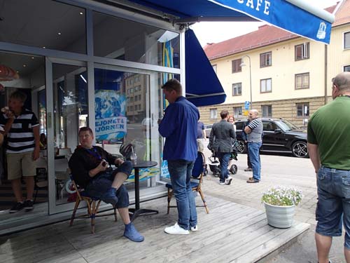 Det blev riktigt trångt på trottoaren utanför Lejonet och Björnen, men trycket lättade lite då många av oss snart stod i kö inne i butiken för att köpa den läckra glass som serveras i lokalen.