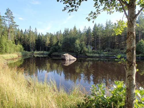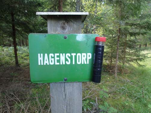 Nu lämnade vi vägen och kom ut i skogen och startpunkten till rundan kring Hagasjön. Totalt 16 burkar finns kring sjön men av dessa var det två som inte blev loggade denna dag, den ena hade vi nog kunnat logga om vi tagit med oss geo-spöt, den andra hittade vi helt enkelt inte!