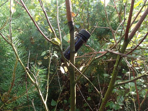 Till en början var skogen ganska vänlig men snart nådde vi fram till de första snåren, en tät björkskog med ett hängande PET rör, det var inte helt lätt men uppgiften löstes.