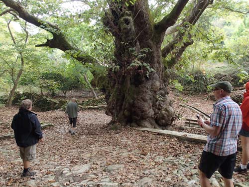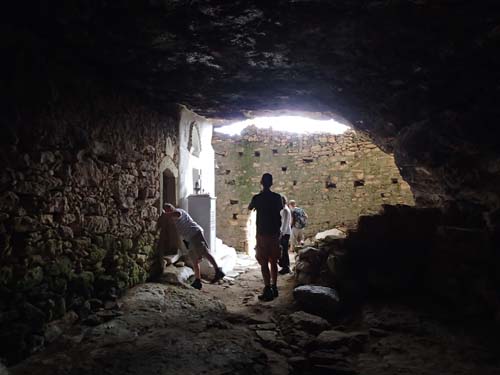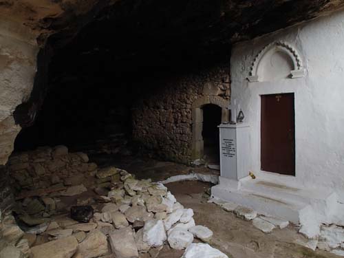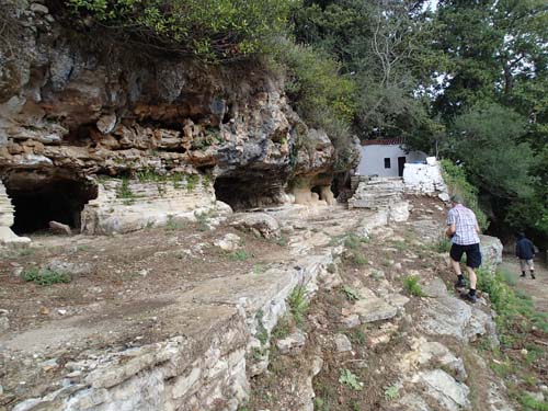 Geo-fordonen rullade snart ut från hotellets parkering och i riktning mot ”Skotini Cave (Dark cave)- St. Nikolaos Chapel”. Det första hindret var att någon hade börjat hägna in området med staket. Det visade sig dock snart att det inte hindrade möjligheten att nå grottan. Det är en plats med en hemsk historia. Den 1 september varje år firas dagen då området blev grekiskt och turkarna hade drivits ut, men här högtidlighålls också de munkar som giftmördades av turkarna! En kvinna som levererade mat till munkarna i grottan tvingades att lägga gift i maten och på så sätt bedövade invånarna. Turkiska soldater gick därefter in och slog ihjäl fyra munkar, de påträffades senare av den femte munken som bodde i grottan och det finns ännu spår av fyra kors som målades av munkarnas blod!