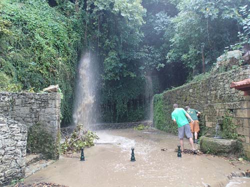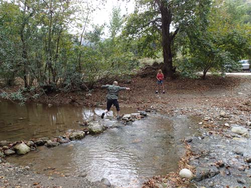 Åskan mullrade på avstånd under vandringen och kom efterhand allt närmare. Vi fick en stund senare avstå från en cache på grund av att åskan med regn och hagel nått fram till oss! En bil ”försvann” på vägen nedför berget – hamnade på egna äventyr – medan återstående bilar tog sig till ”Silver Spring Moundros”. Det kunde ha varit en helt vanlig burk utmed vägen men även här drog åskan in över oss med skyfall. Det var mycket dramatiskt när ett vattenfall plötsligt skapades utmed bergssidan och vi fick söka skydd under ett litet tak tillsammans med en grupp tyska vandrare!