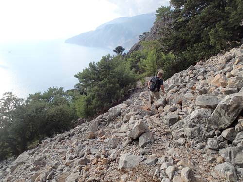 Vi tog oss allt längre ned och snart syntes inte LHCper och -bacon- till längre, var dom tagna av trollen? När Hallén och TMR68 nådde den lägsta punkten vid cachen ”Crossroad to Agio Ioannis E4 CTC” fick vi se att den var loggad samma dag, var det så att FTF möjligheten som låg 2,5 kilometer bort fågelvägen också var loggad? Vi fick fatta ett avgörande, skulle vi gå mot cachen eller skulle vi avbryta? Det var mindre än en timma till solen skulle gå ned och det var bitvis en svår väg upp, dryga 500 höjdmeter. Vårt beslut blev att avbryta FTF jakten och ta oss uppför så mycket som möjligt av berget medan det ännu var ljust, ett gott beslut trotts allt.