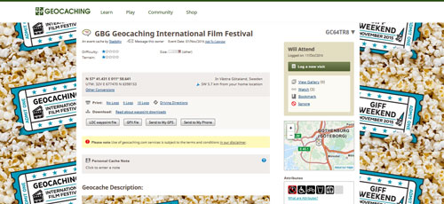 Runt om i världen organiseras GIFF (Geocaching International Film Festival) event helgen 5-8 november. I min närhet arrangeras ”GBG Geocaching International Film Festival” av StadsAlv den 7 november. Det är första gången finalisterna i denna festival presenteras för oss alla, alltid trevligt att hämta idéer till egna framtida geocachingfilmer! Jag tänker var med – kommer du?