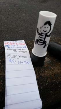 Det var ganska lugnt och stilla i bostadsområdet, bara några enstaka mugglare var ute. Jag trodde först på fel typ av gömma men när jag ändrade fokus lite och nivå dessutom så kunde jag snart lokalisera ”Leia’s cache 0” och med ett medhavt verktyg så fick jag även fram burken ur sitt gömställe.