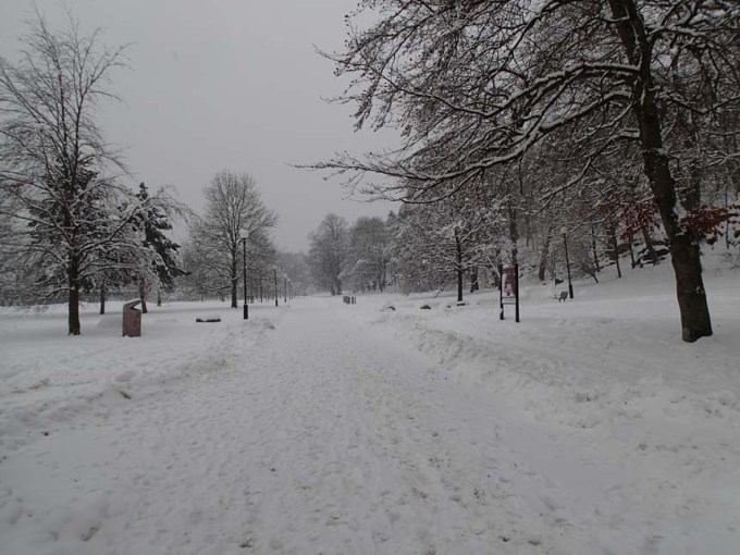 Någonstans i denna park skall det finnas en burk (som Hallén inte loggat). Undrar var den kan gömma sig? Nu har vi haft en superhöst som övergått i superstorm med tilltagande superkyla som drog fram tillsammans med supersnön, nu väntar vi dessutom på supervärmen, undrar om det idag kan bli en logg på en supermulti eller får jag helt enkelt nöja mig med att hitta en final någonstans i parken?