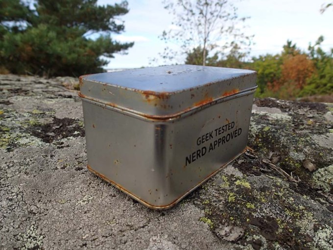 Denna runda medförde att ännu en DNF från hösten 2014 idag omvandlades till en glad gubbe på kartan – ”lek3”. När den var avklarad vände jag och gick bort mot vattnet och cachen ”Godisarnas godisask #1 ”BadToro” där behövdes inte något letande då en stor grupp burkletare redan var församlade, det var bara att signera loggboken – vilken lyx!
