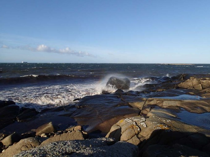 Vinden var verkligen pinande ute på denna halvö och när man kom nära havet slog vågorna upp över oss. Det var nödvändigt att bitvis gå mycket nära vattnet och vid en av burkarna skulle det finnas en nano i en sten, men jag var genomblöt redan efter två minuters sökande och det gav inte resultat – därmed blev det reträtt!
