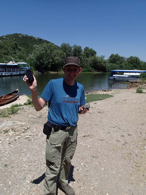 Målet var det lilla fiskesamhället Virpazar vid Shkodersjön. Idag är nog turister viktigare än fiske i byn, åtminstone under sommaren. Vi tog den obligatoriska båtturen och därefter fanns gott om tid att leta efter traktens enda burk, ”Virpazar” jag fick här sällskap av norska geocacharen rosiante67 samt guiden Marie och flera andra som var nyfikna på hur burkjakt kunde gå till. På normalt geocachingvis stod vi med huvudena i var sin buske när vi hörde någon ropa uppifrån den övre nivån på piren (på engelska) – letar ni efter en fejksten?