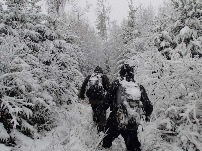 Vi fortsatte vidare in i skogen och löste både lätta och svåra burkar, en del tog tid, lång tid. Det stilla duggregnet övergick nu i ett lätt snöfall och skogen började ändra skepnad.