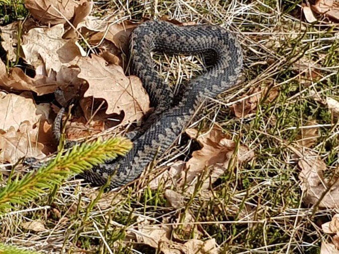 Det visade sig vara en riktig huggorm, mitt fotavtryck visade att jag satt ned kängan dryga 2 dm från ormen utan att se den. Dagens oväntade händelse, trodde inte att ormarna redan vaknat.