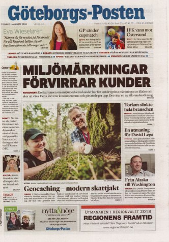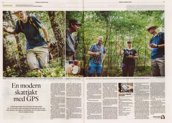 Den 17 juli berättade jag här om när vi var ute och visade Michaela Karlén och fotografen Jenny Ingemarsson från GP hur det går till att geocacha. Idag kom artikeln och det blev ett helt uppslag i tidningen, dessutom bild på förstasidan! Artikeln samt ytterligare några bilder finns även på nätet, men det krävs att man betalar för att få tillgång, men det finns bibliotek där det går att läsa samt alternativet att betala 1 krona för att få läsa alla artiklar under en månad. (http://www.gp.se/nyheter/g%C3%B6teborg/hittar-g%C3%B6mst%C3%A4llen-med-geocaching-en-modern-skattjakt-1.7767073)