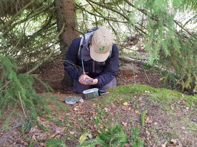 Men några enstaka siffror fick vi och gjorde ett antagande om en ungefärlig plats. När rundan var avslutad gick vi mot denna plats och efter avsökande av några objekt som omnämndes som hint på cachesidan hittades burken!