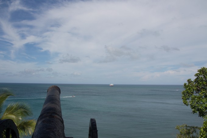 Men först blev det en kortare båttur till en av de mindre öarna, där klättrade jag upp till en av Morgans kanoner som pekade oroväckande i riktning mot Fram, så jag vred den lite till vänster….