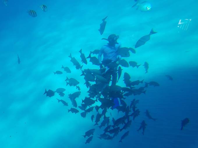 Här var det möjligt att se korallreven utan att bli det minsta blöt! Farkosten åkte sedan omkring över revet och det blev många fantastiska vyer, stingrocka, sköldpadda, dykare och ett antal obekanta fiskar – även en del fula.