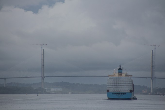 Framför oss syntes en av giganterna, Maersk Bintan, 223.5m × 32.2m, 43097 t dödvikt.