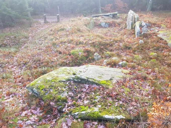 Jag hade nu lämnat leden och gick på lite större grusvägar bort mot ”Julen varar än till påska! 3 Dymmelonsdag”, en riktigt fint utformad burk var det som väntade! Efter några hundra meter på grusvägen kom jag ut på den trista asfalterade vägen och började gå ned mot Jonsered. En ljuspunkt utmed den vägen var att där låg ännu en burk, en ganska färsk julkalenderburk dessutom ”Jul i Lerum 2018 #12”. Den var snabbt hittat och loggad och jag kunde fortsätta min vandring. När jag åter kommit in på Bohusleden passerades den imponerande hällkistan.
