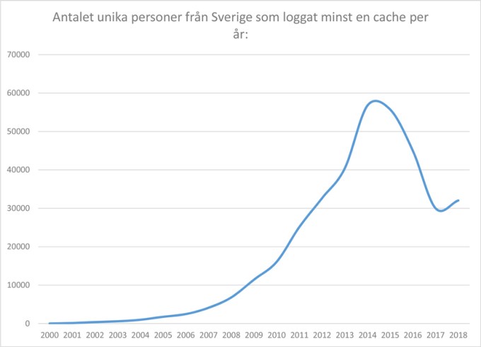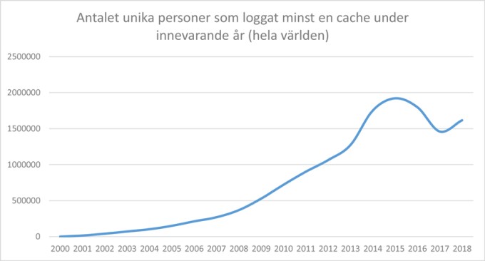 År 2017 såg det sannerligen dystert ut för geocachingen och under rubriken ”Geocaching – en hobby på utdöende?” redogjorde jag för den nedåtgående trenden i Sverige och i ett uppföljande inlägg 2018 med rubriken ”Kris eller nystart för geocachingen?” kunde jag presentera mer data med hjälp av uppgifter som tagits fram av project-gc. Nu när 2018 har lagts till handlingarna är det dags att summera året. Min försiktiga optimism verkar inte ha varit ogrundad, i Sverige var det 2048 fler aktiva geocachare, alltså som loggat minst en cache under året, jämfört med 2017. Även globalt ökade aktiviteten inom geocachingvärlden. Nedan presenteras tre diagram, två för antalet unika personer (alltså gc-konton) som loggat minst en cache i världen och i Sverige i absoluta tal, samt sist ett index där Sverige och världen jämförs.
