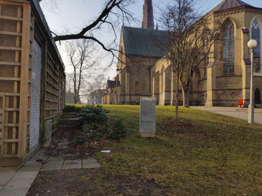 Vid 6.30-tiden anlände den 5:e av cachinglinjer in till centrum och jag klev av för att gå mot den nya burken ”Vasakyrkan”. Även om platsen något av en bakgata så var här ändå mugglaraktivitet. Två personer som skulle in till det närbelägna dagiset fick väntas ut innan jag kunde ”slå till” och logga burken.