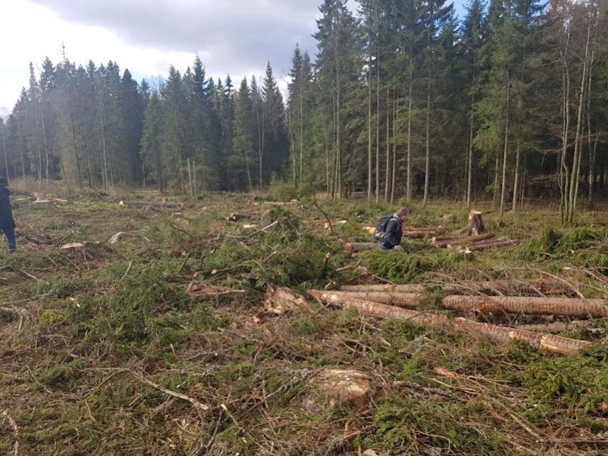 Vi kanske skall viska tyst om hur det kan se ut i en del vattendrag. Lyckligtvis var burken på torra land och inte i Neptunus kundvagn på bilden ovan. En och annan mugglare uppe på bron undrade nog vad Hallén & Co höll på med på denna plats, något för dem att tala om under de långa mörka vinterkvällarna. Till sist kom vi bort från asfalten och ut i skogen, det som var kvar av den. Många områden domineras av kalhyggen och det är extra oroande när man letar efter en burk med hinten träd, se bilden nedan. Avverkningen hade dessutom skett ganska nyligen och vi hade litet hopp om att finna burken. Men så, när jag tittade vid foten av det som var kvar av ett träd, där låg burken, helt oskadd. Det är nästan så man kan tro att en högre gc-makt vakat över den!
