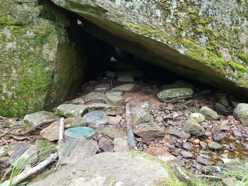 Några troll såg jag inte till, däremot en burk – dock inte i den lilla grottan. Loggningen var snabbt avklarad och därefter sökte jag mig ned mot den plats där jag skulle träffa TMR68 och Jsson för en tur ut i skogen i jakten på en multi. Vi var tungt lastade med utrustning för det var finalen vi skulle gå mot idag. Utrustningen kom väl till användning, men vad hjälpte det när vi inte lyckades övervinna det sista hindret…. Det blev ett lite snopet slut på vandringen, men vi fick skogsluft, motion och några blåbär!