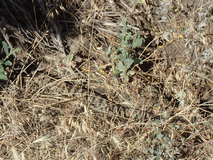Alla rusar ut och vi får se nosen på en orm passera genom gräset och slutligen den tydligt formade skallran. Ingabo var några få steg från att kliva på djuret, men lyckligtvis fick han en varning och hörde – samt regerade – på varningen och backade undan från burken. Det blev en bild på ormens ”mitt” i gräset innan den försvann in under en buske. Enligt amerikaner som vi träffade senare under dagen var vi alldeles för nära…!