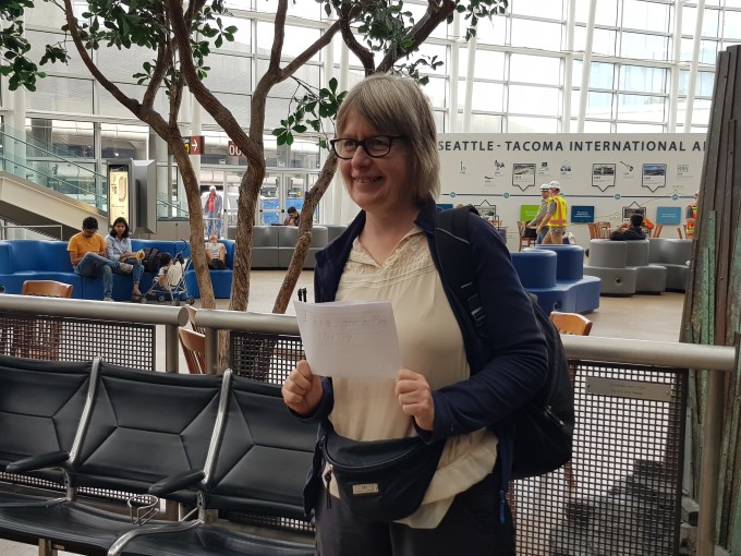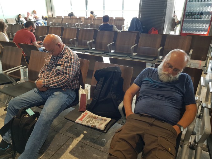 Efter den långa färden över Nordamerika och vidare över Grönland mot London hade vi en lång väntan på eftermiddagsflyget till Göteborg. Alla var rejält trötta – även de som aldrig säger sig vara trötta – men det finns numera fotobevis på. Detta fick bli resans sista ”förnedrande” bild på övriga deltagare.