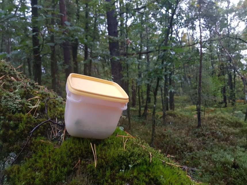 Lördag förmiddag finns lite tid att bege sig ut i en närbelägen skog för att jaga några burkar. Vandringen startade drygt en timma innan soluppgången och gick i östlig riktning från cachingbasen. Efter några kilometers tur på gator och asfalt blev det äntligen dags att bege sig ut på stigar och även lite turer ut i stiglöst land. Där visade det sig inte var öde trots att det var något ensligt, trakten var befolkad av bevingade varelser som trodde Hallén var en älg, visserligen älgade jag på, men fyrbent har jag väl ändå inte blivit! De kontaktsökande varelserna var älgflugor, och de var många i dag, fick avliva ett stort antal som klättrade omkring i håret. Trots dessa irriterande varelser gick jag rakt mot dagens första burk, men mugglarna försökte som vanligt skapa förvirring. Denna gång hade se satt upp ett anslag på ett träd som försökte antyda att jag var på fel spår, men så lätt lurad är jag inte!