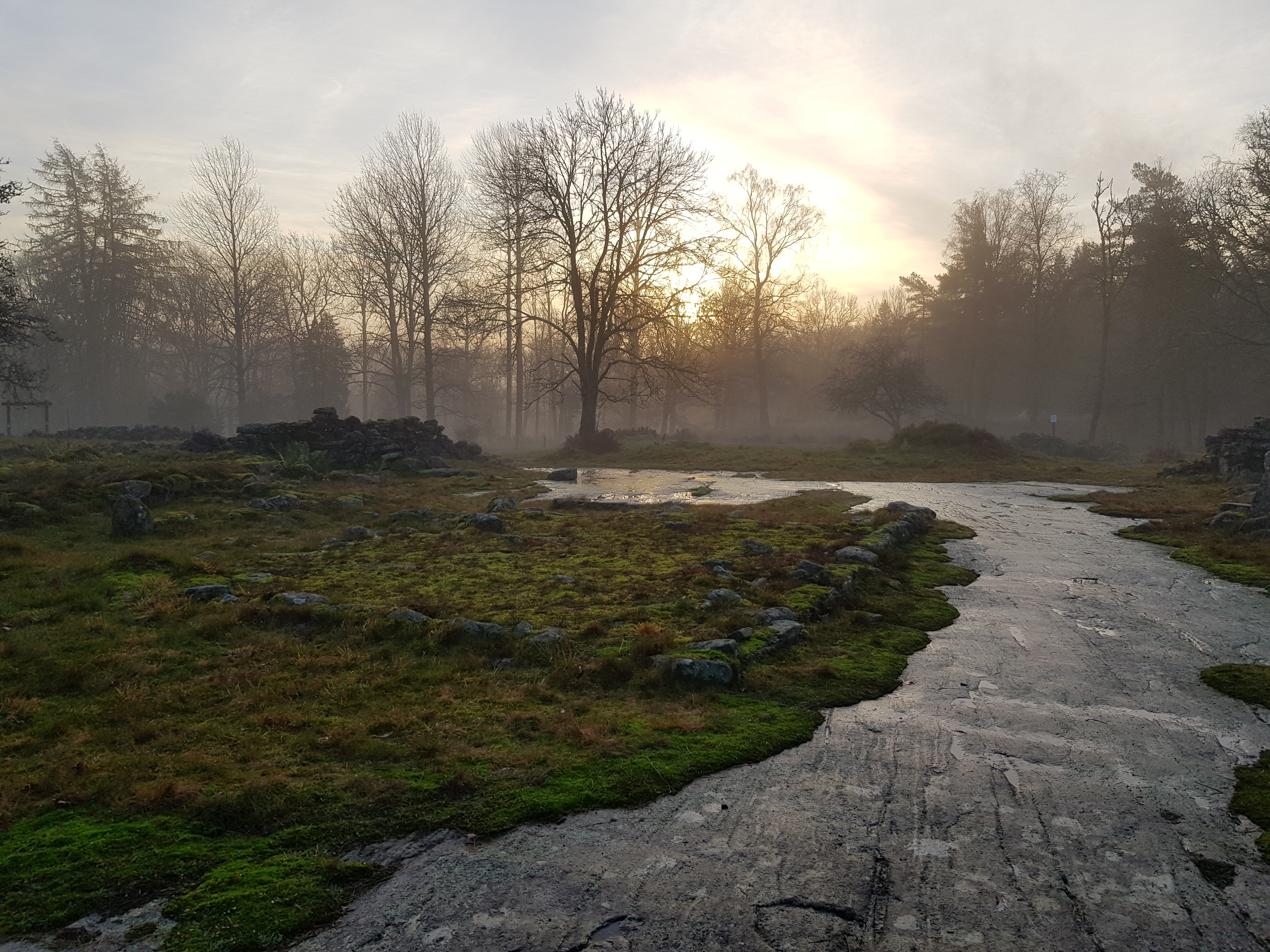 Först passeras det moderna Björsjöås innan man når höjden där den övergivna gårdens ruiner finns. Det är alltid lika intressant att besöka denna plats som kan ha varit bebodd sedan 1200-talet, men helt säkert från 1500-talet. Denna dag gjorde solens försök att bryta igenom dimmorna landskapet extra intressant att fotografera.