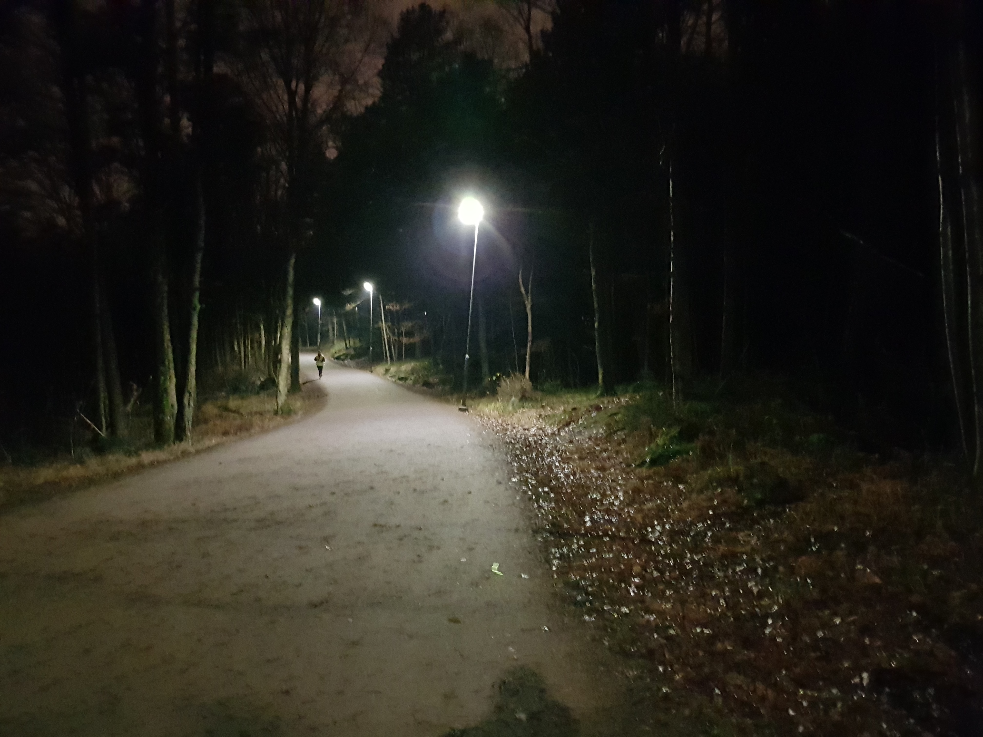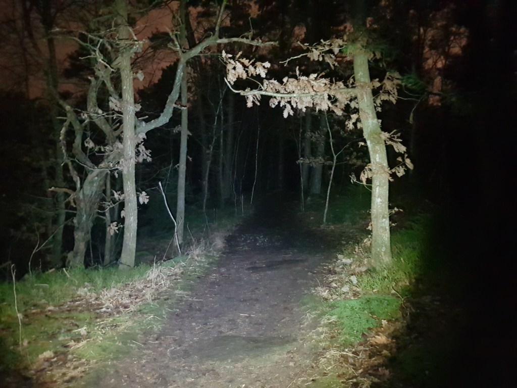 När jag närmade mig det femte delsteget såg jag lampor som lyste, kunde det vara någon mer som var ute och gick rundan? Nej, det var en stor grupp mugglare som höll på med märkliga övningar på sandstranden, några gick dessutom ned i vattnet! Kraftfulla skrik hördes över tjärnen – ”det är kallt”. Ja, vad skall man säga, hoppa i vattnet när det inte alls ingår i uppgiften. Jag valde istället att trappa upp och därefter fick jag en uppenbarelse i form av koordinater till bonusen.