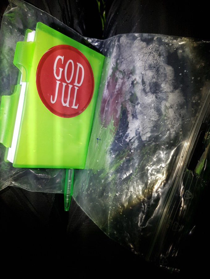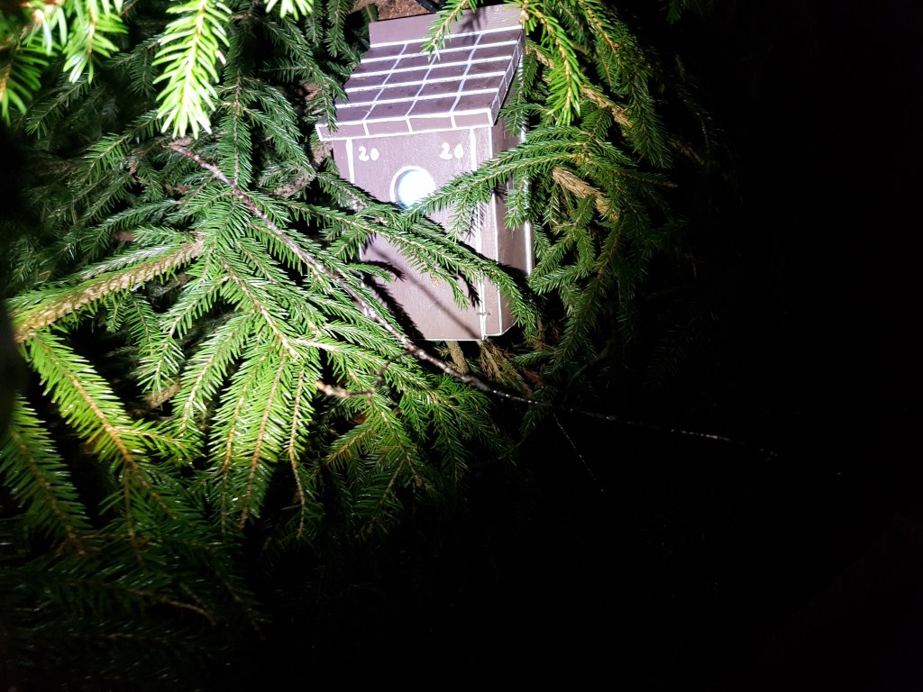 Det regnade lätt när jag närmade mig nollpunkten mitt inne bland en mängd små julträd, det fanns en del att välja på! Jag gick runt, runt, runt i cirklar kring dessa barriga varelser – det är väl så det skall vara när det närmar sig jul! När jag åter tittade på cachebeskrivningen upptäcktes att burken var större än vad jag hade tänkt mig, alltså kunde de minsta av julträden uteslutas. Istället fick jag, liksom FTF-jägarna för mig, utöka sökområdet. Det gav snabbt resultat och ett pepparkakshus påträffades, dock utan någon inneboende häxa men med en loggbok, vilket givetvis var det viktiga.