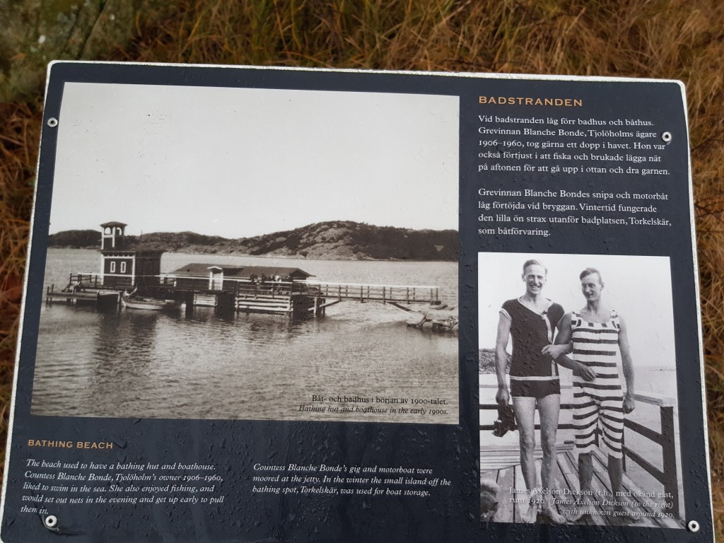 Utmed den slingrande stigen gick färden vidare mot Badplatsen, där sökandet dessvärre inte var framgångsrikt. Men en tröst var att se ytterligare en av de informativa skyltarna som berättade om området och hur badstranden såg ut för drygt hundra år sedan.
