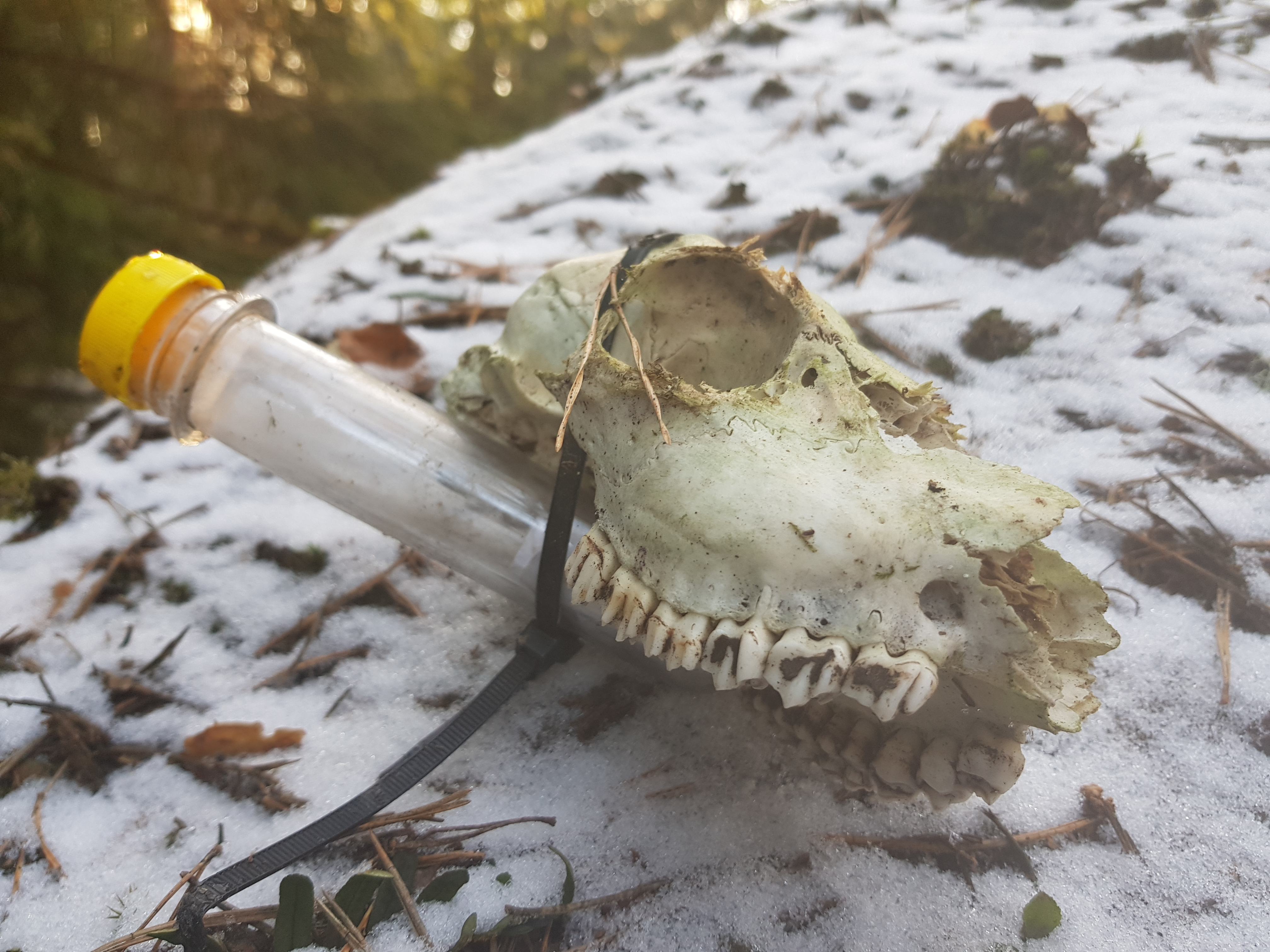 Nummer åtta, nio och tio klarades av i rask takt. Det fick även bli lite att äta vid en av dessa burkar (det är inte resterna av lunchen ni ser ovan…) När dessa burkar var loggade fanns också samtliga ledtrådar noterade och färden gick mot Grandalsrundan # 11 Final. Där fick jag en rejäl överraskning, det var länge sedan jag upplevde en cache av denna kaliber! När jag loggade gick mina tankar till tiden strax före disputationen då avhandlingen skall anslås – har tydliga likheter med denna cache!