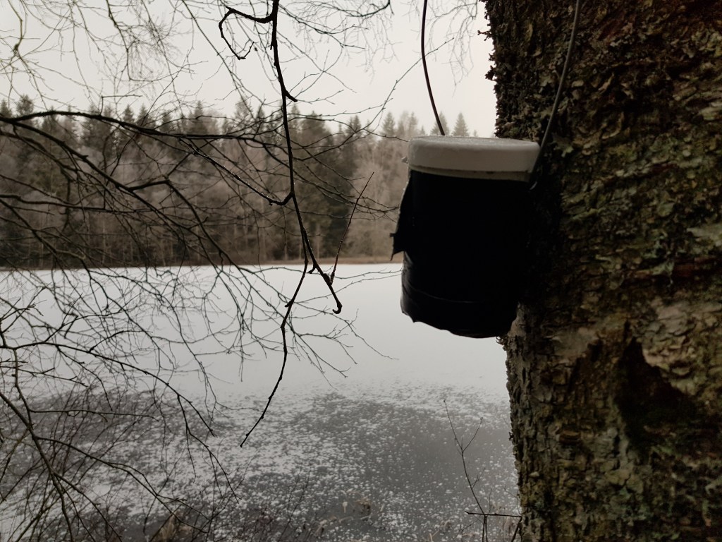 Det krävdes en stunds letande då det skedde på tok för långt in i källarbyggnaden. På väg ut så hittades burken. Även om det tog några minuter extra så fick man ändå tillfälle att studera det lokala djurlivet, djupfrusna spindlar. Nu blev det Tjärn #10 som var nästa cache som skulle få besök. Den hittades omedelbart intill den lilla frusna tjärnen.
