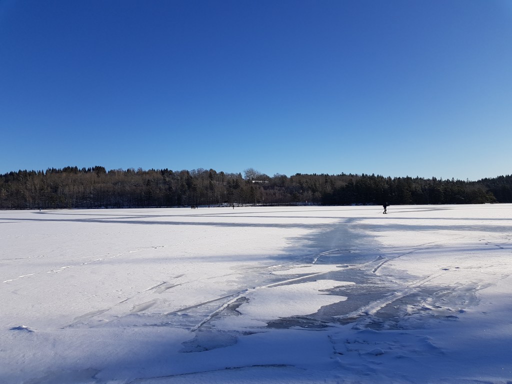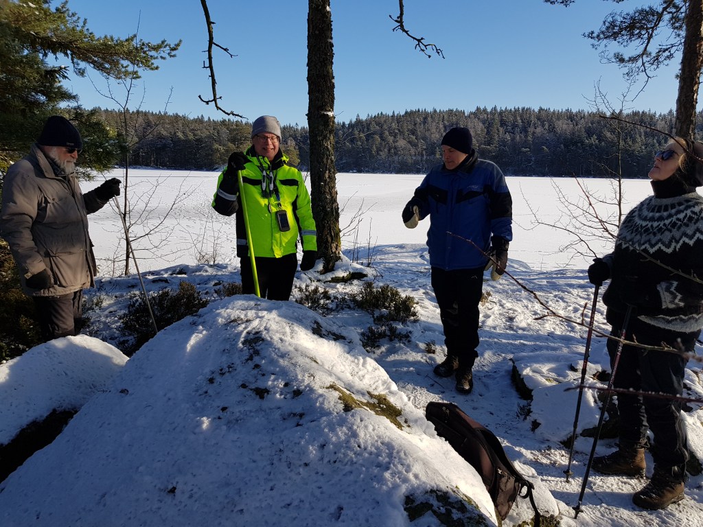 Nära mini-ön hade snön smält kring Ragnarssons fotspår och jag klev försiktigt ut på den återfrusna isen, men den var hård så allt gick bra. Burken hittades sedan omedelbart och jag gick i mina egna fotspår tillbaka mot land. Nu fanns lite tid innan övriga skulle anlända så jag slog mig ned med utsikt över sjön och åt lite av min medhavda matsäck, riktigt härligt!
