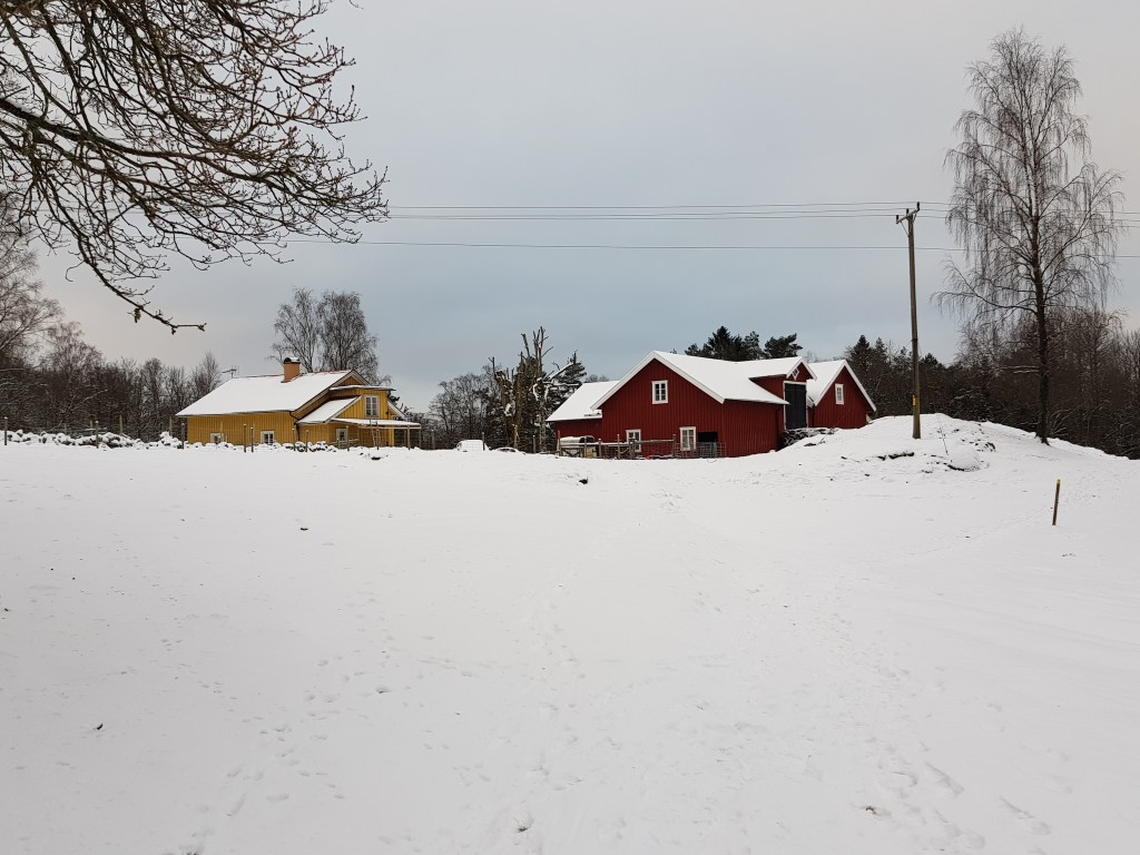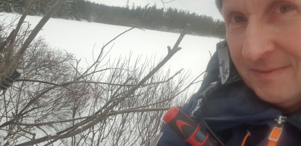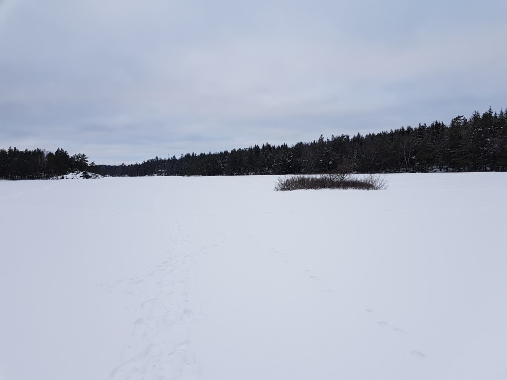 Det var alltså inte bara vintern som var rena rama 1700-talet, det gällde även burkarna som nästan alla denna dag gick på temat 1700-tal inom ramen för de 400 burkar som läggs ut inför stadens 400-års jubileum. Trots snön skulle det visa sig att det inte var några problem att hitta cacherna. Endast en enda burk utanför serien blev loggad denna dag och det var också med anledning av det rejäla vintervädret. Kring Stora Björsjön ligger serien Revben som loggades redan 2014 men ute i sjön ligger Revben nr 5 ologgad, en T5:a. Den snötäckta isen bredde ut sig likt ett salsgolv och efter att ha hängt isdubbarna om halsen begav jag mig ut på den korta promenaden till mikro-ön.