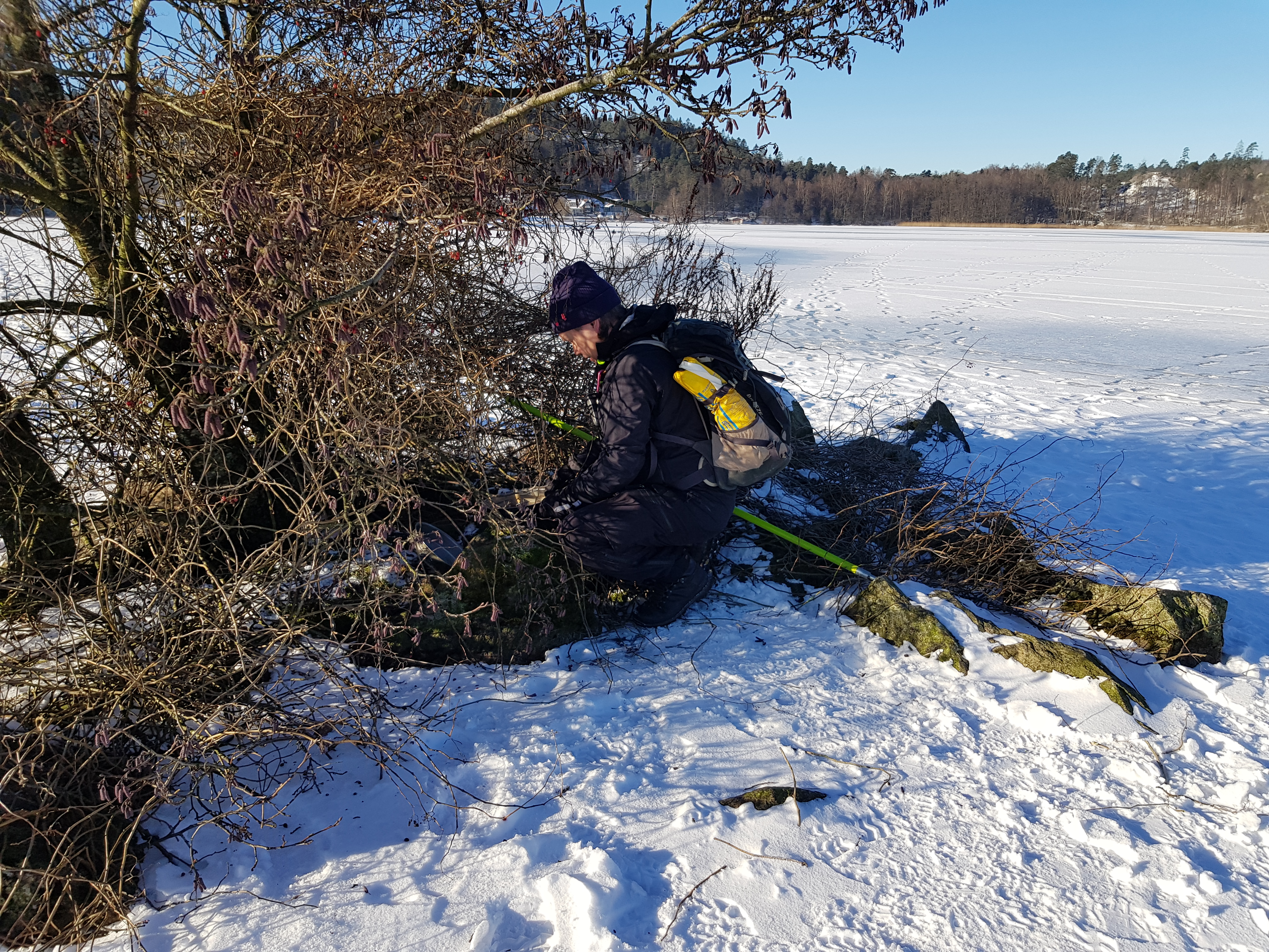 Vandringen gick nu åter i riktning mot stranden, men vi gjorde en mindre avstickare till cachen Landvettersjön, och istället för att gå på vägen gick vi på sjön tillbaka mot bilarna. Kanske skall vi hitta på något mer denna vackra vinterdag? Inte allt för långt bort fanns en liten grupp burkar som skulle vara möjliga att logga. TMR68 hoppade in i sin bil för att visa vägen och Hallén startade upp Rulle T och följde efter.