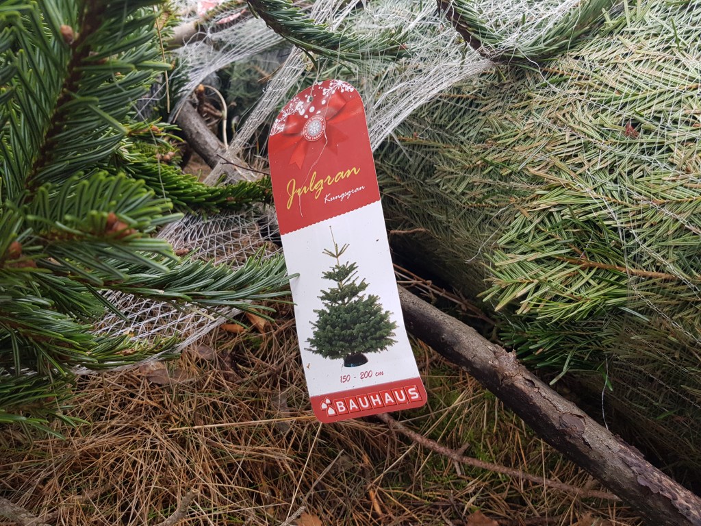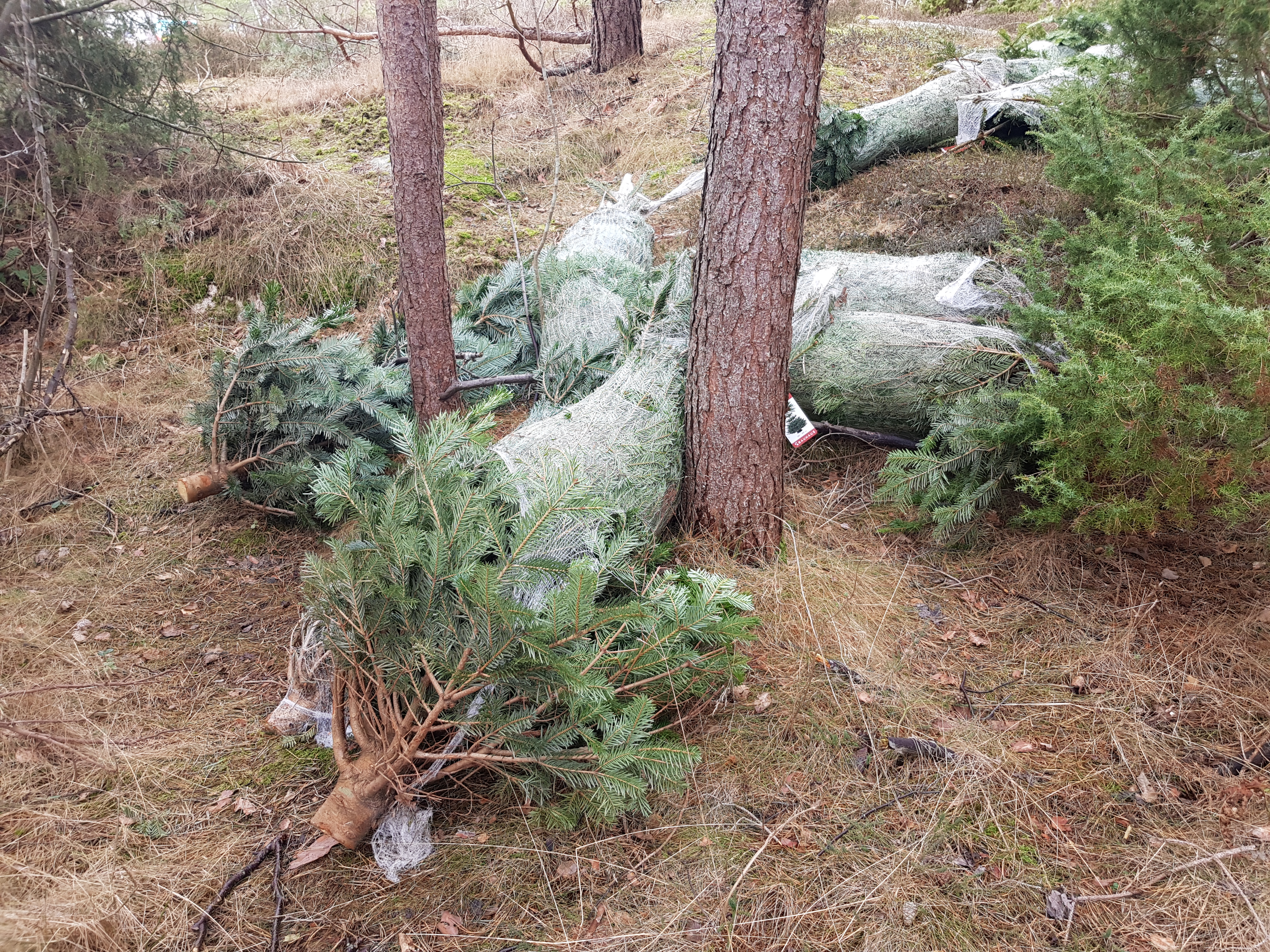 Däremot påträffades något annat, något överraskande nära #390. Först trodde jag att det var en julkalendercache då det låg fullt med julgranar på marken! Inte några som fällts på platsen utan som avsetts att säljas. Man kan undra hur dessa hamnat i denna sluttning. Kan det finnas någon koppling till julgranskriget ute i skärgården? Bauhaus i Sisjön donerade överblivna granar efter jul, man trodde att det var till Öckerö kommun men i själva verket var det privatpersoner som tog granarna. Alla granar kom inte med ut till öarna, ett antal dumpades i Sisjön och vid Älvsborgsbrons fäste. Kan detta vara ytterligare en rest av denna donation, eller är det en hemlig gömma inför påskeldarna?