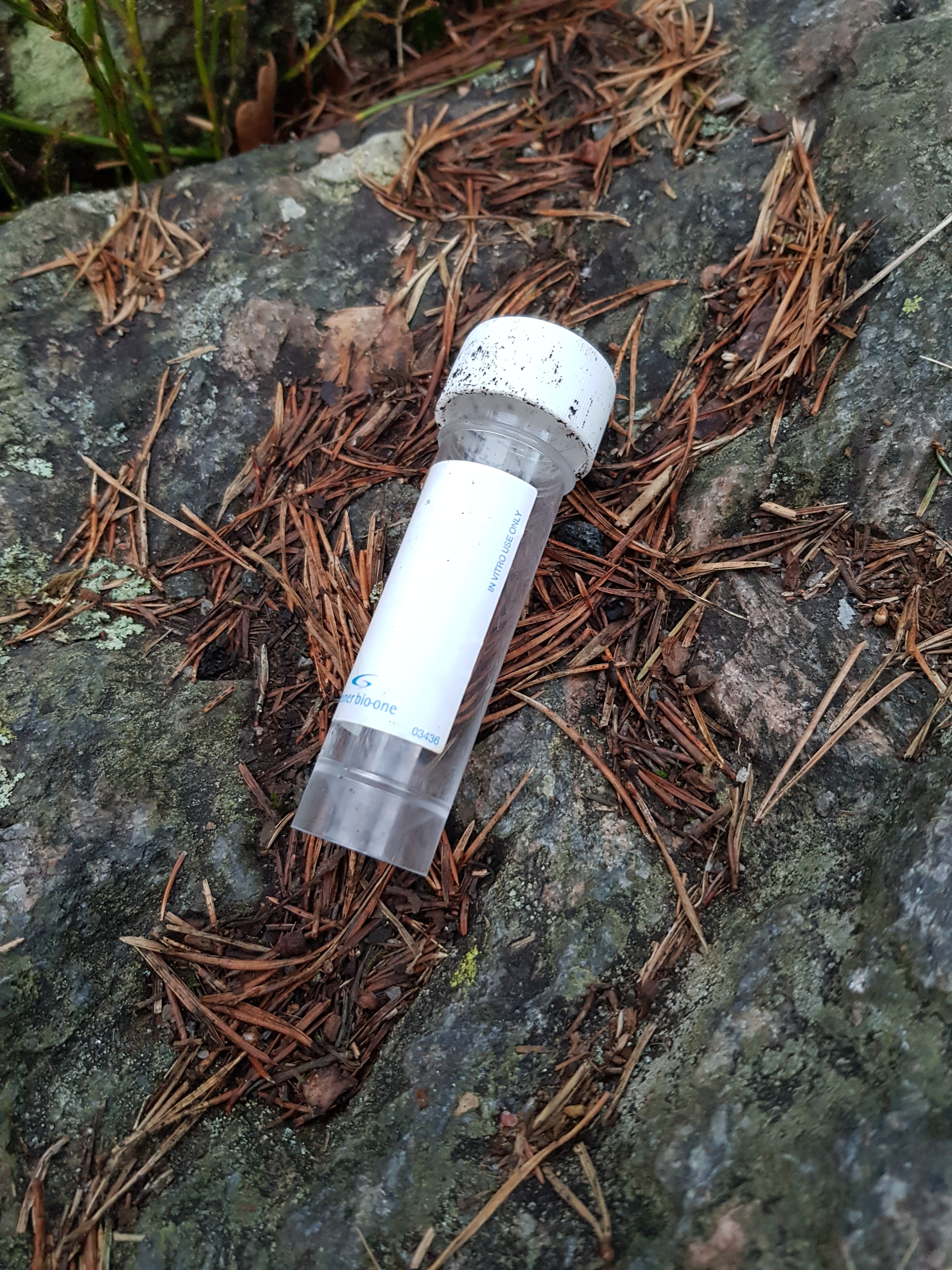 Det var inte ens 200 meter att gå från parkeringen så jag var snabbt framme vid nollpunkten och där låg endast ett litet platsrör, av den modell som CO brukar använda, utan kork och utan loggbok. Korken hittade jag längre in under stenen bland en mängd skräp, men ingen loggbok. Jag hade en mindre loggremsa med mig och kunde därmed ”återskapa” cachen, nu återstår att se om CO ger sitt godkännande.